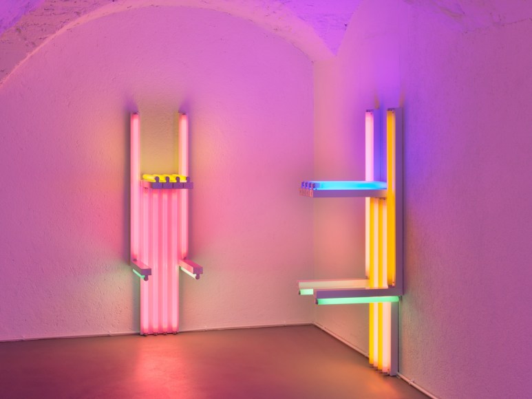 View of “Dan Flavin, to Lucie Rie and Hans Coper, master potters,” 2017. From left: untitled (to Lucie Rie, master potter) 1w, 1990; untitled (to Lucie Rie, master potter) 1fff, 1990. Artwork © Stephen Flavin / Artists Rights Society (ARS), New York; Photo by Stefan Altenburger; Courtesy the Estate of Dan Flavin and Vito Schnabel Gallery